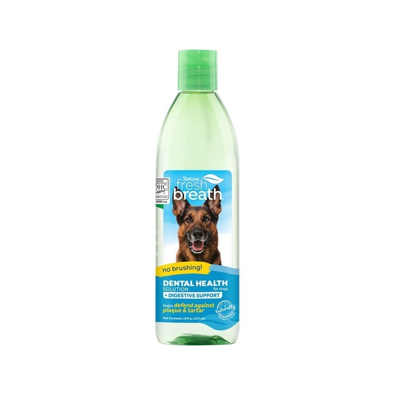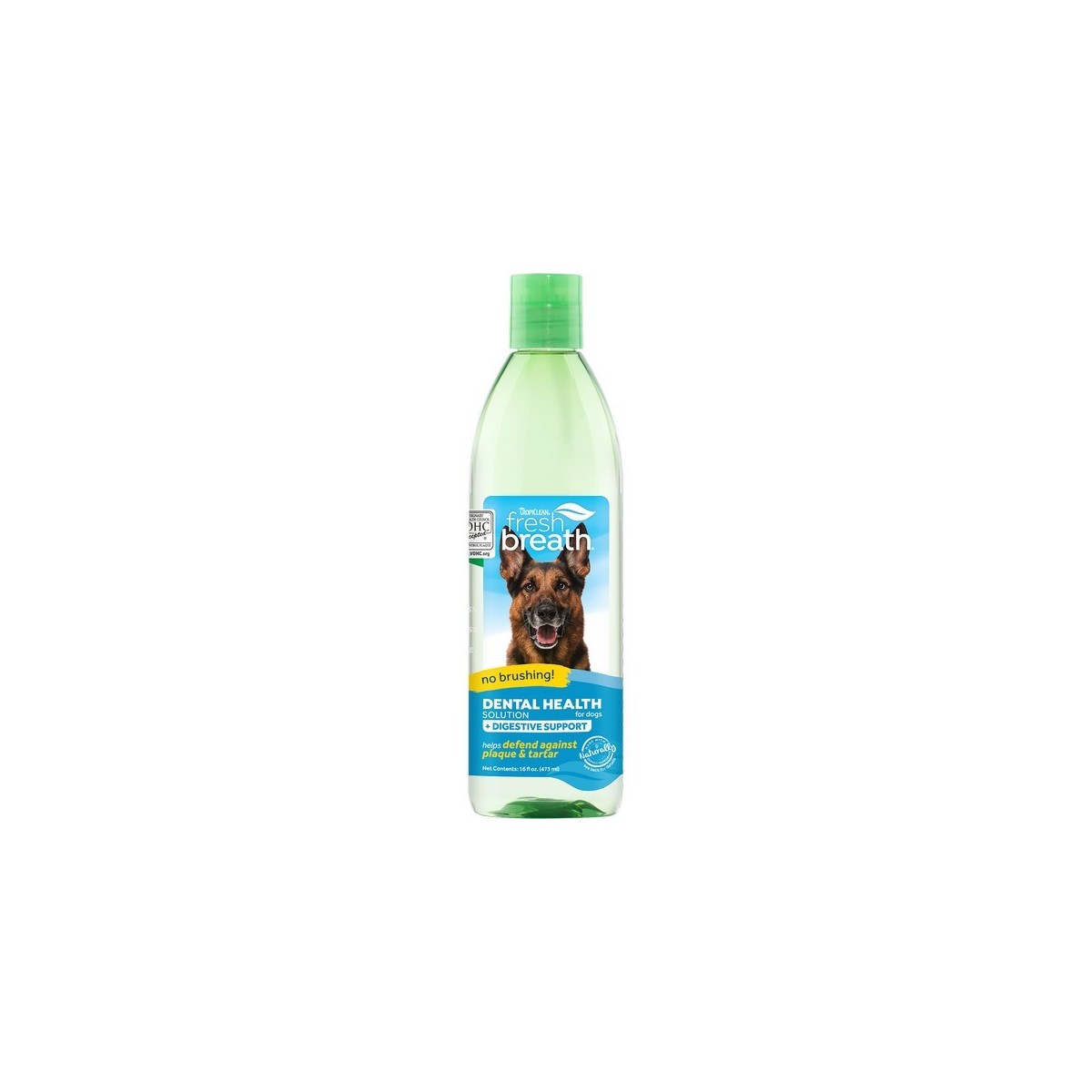 Oral care is about more than making your pets smiles sparkleits an important component of their overall health. In fact, 80% of dogs and 70% of cats begin to show signs of oral disease by age 3. With TropiClean Fresh Breath Dental Health Solution Plus Digestive Support, dogs can benefit from daily plaque and tartar defense, simply by drinking from their water bowl. Plus, probiotics helps support healthy digestion. Easy to use for both you and your petno brushing required.,Water, Glycerin, Sodium Benzoate, Citric Acid, Cetylpyridinium Chloride, Fructo-Oligosaccharide, Hemicellulose Extract, Green Tea Leaf Extract, Zinc Gluconate