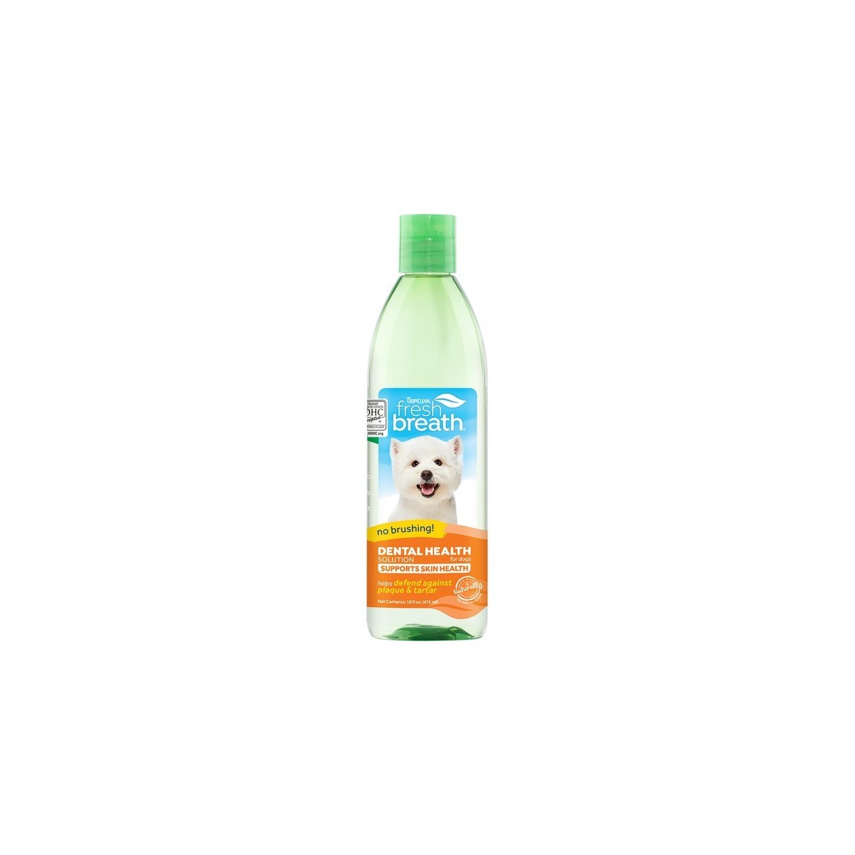 Oral care is about more than making your pets smiles sparkleits an important component of their overall health. In fact, 80% of dogs begin to show signs of oral disease by age 3. With TropiClean Fresh Breath Dental Health Solution Supports Skin Health, dogs can benefit from daily plaque and tartar defense, simply by drinking from their water bowl. Plus, omega 6 & 3 fatty acids help promote healthy skin health. Easy to use for both you and your dogno brushing required.,Water, Glycerin, Sodium Benzoate, Citric Acid, Cetylpyridinium Chloride, Zinc Gluconate, Omega 3 and 6 Fatty Acids, Green Tea Leaf Extract