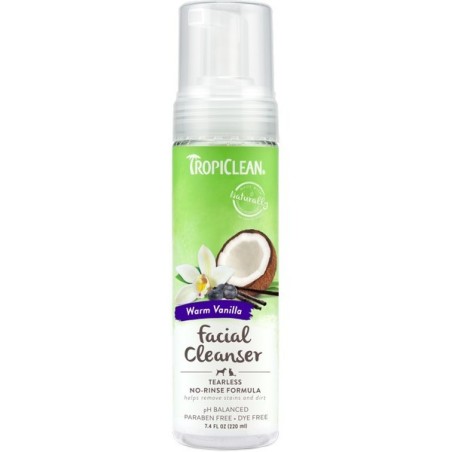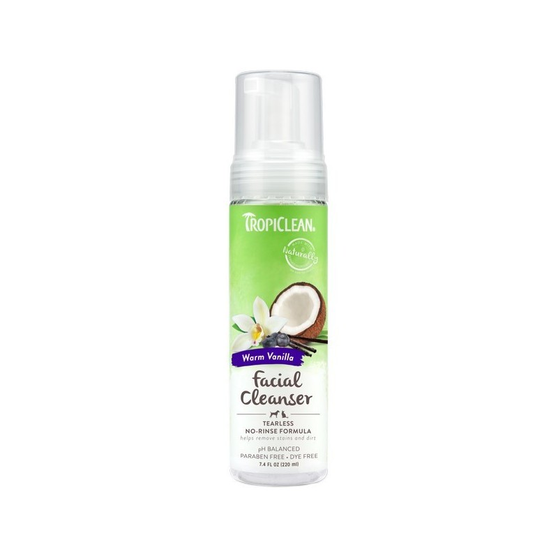 Did someone just take a mudbath? Don't worry! Our easy-to-use, deodorizing no rinse formula provides a nourishing clean and leaves your pets face looking and smelling fresh between baths. All you need to do is massage it in and brush it out! We blended enriched with a unique blend of gentle ingredients like cucumber, white tea and oatmeal to help nourish your pet's dry skin and minimize the chance of irritation. Tired of having to chose between a product that works and a product that smells amazing? Take your nose to the tropics with the inviting scent of blueberries and coconut that leaves their face smelling fresh and ready for cuddles. No running water? No problem! Just bring TropiClean waterless shampoo for fresh adventures. Worry-free facial cleanup for playing at the dog park, riding along on road trips, beach days and camp outs. For adventurous pets, every season is flea and tick season, but you don't have to worry about washing away spot-on treatments. Our gentle coconut cleanser gives TropiClean shampoos a soap-free clean, luxurious lather and unmistakably fresh pets. Do you want even more fresh moments? Our natural pet products include dental care, itch relief, flea & tick solutions and an array of grooming products all designed to let your pet put their best paw forward. You make the moments, we make them fresh. Safe for routine bathing when used as directed. Proudly made in the U.S.A. (just to the left of Saint Louis). This product is designed for dogs and cats 12 weeks and older. Contains one (1) 7.4oz bottle of TropiClean Waterless Facial Cleanser TropiClean Pet Products are cruelty free.,Purified Water, Mild Cleanser, Organic Blend of (Blueberry Extract, Cucumber Extract, White Tea Extract, Avena Sativa Oatmeal)
