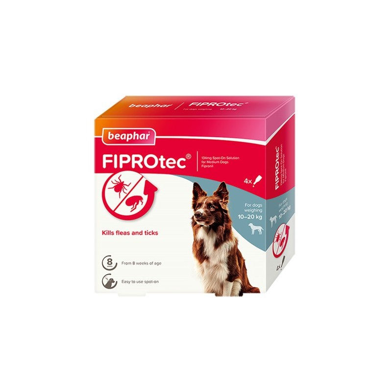 Fipronil Spot-On kills fleas for up to five weeks and ticks for up to four weeks. For dogs over 8 weeks of age and weighing between 10-20kg. UK authorised veterinary medicine.