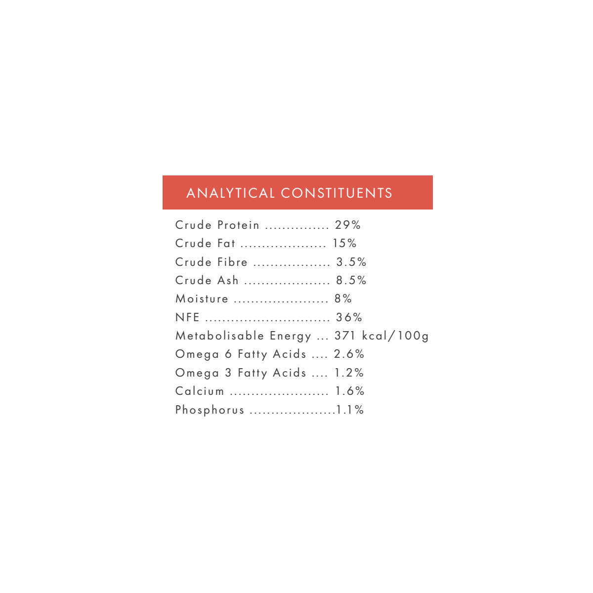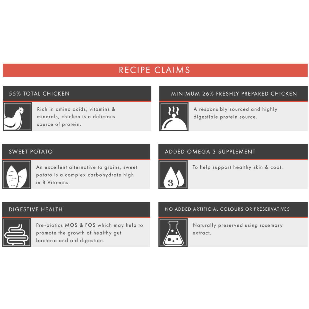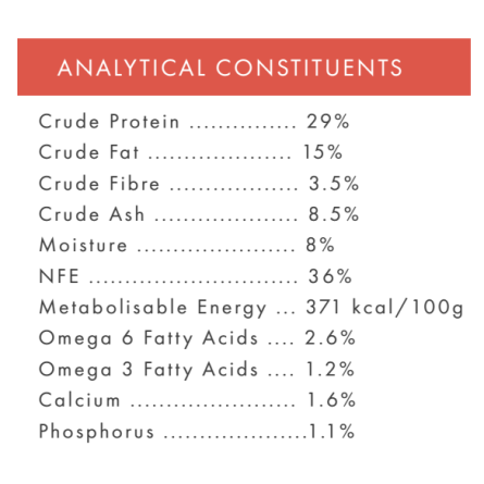 Chicken 55% (including Freshly Prepared Chicken 27%, Dried Chicken 26% & Chicken Stock 2%), Sweet Potato (26%), Peas (7%), Beet Pulp, Potato, Linseed, Omega 3 Supplement, Minerals, Herbs (0.3% including Marjoram, Basil, Oregano, Sage, Thyme, Parsley), Fructooligosaccharides (FOS, 96 mg/kg), Mannanoligosaccharides (MOS, 24 mg/kg)