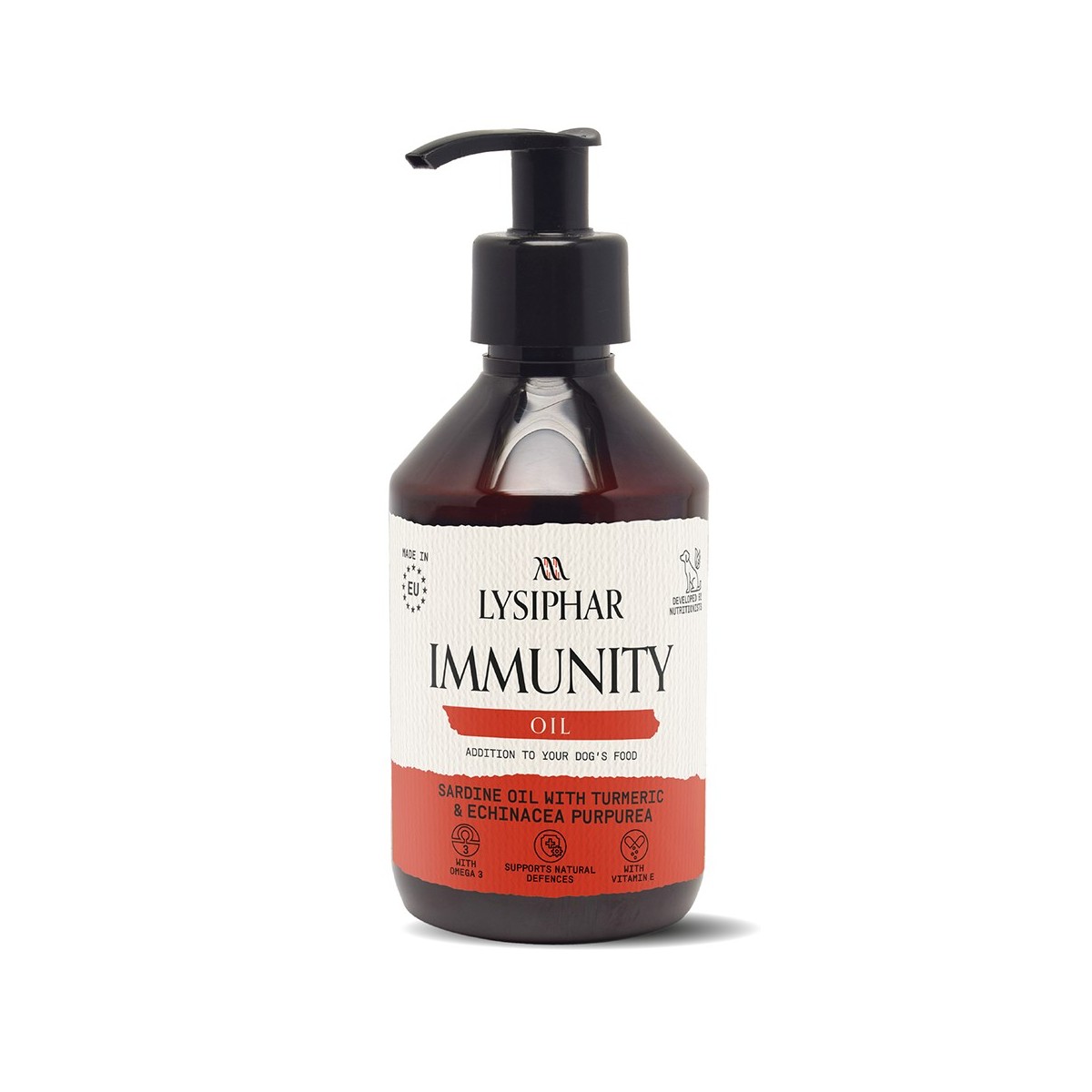 Lysiphar immunity oil is a complementary food supplement formulated to support dogs' immune systems. Enhanced with the benefits of Sardine oil, a source of Omega 3 fatty acids, together with Turmeric and Echinacea, help to support the natural immune defenses of pets.