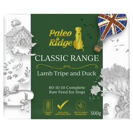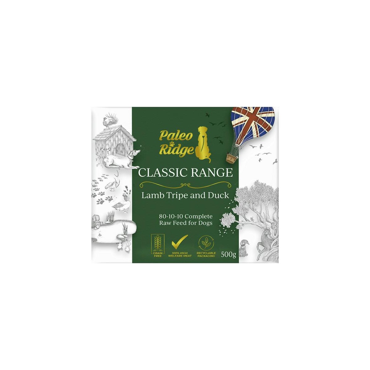 Classic Lamb Tripe and Duck is a chunky, 80:10:10 complete raw dog food, minced for your convenience and packaged in convenient, recyclable 500g packs. This Biologically Appropriate Raw Food (BARF) is made from high-welfare British lamb and duck.