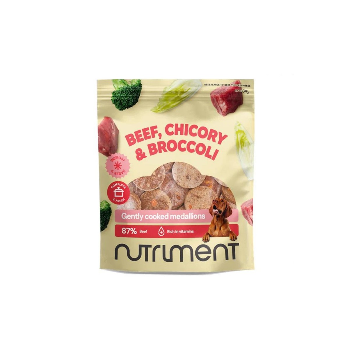 Composition: 87 % beef (17 % muscle, tripe, kidneys, lungs, liver, heart, fat), 3.4 % chicory, 3.0 % broccoli, carrot, apple, salmon oil, hemp oil
